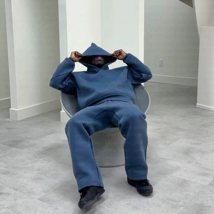 This men’s two-piece set features a relaxed-fit top and matching pants, designed for casual days and light activity. The oversized design and clean silhouette offer versatility for lounging, errands, or everyday outings.