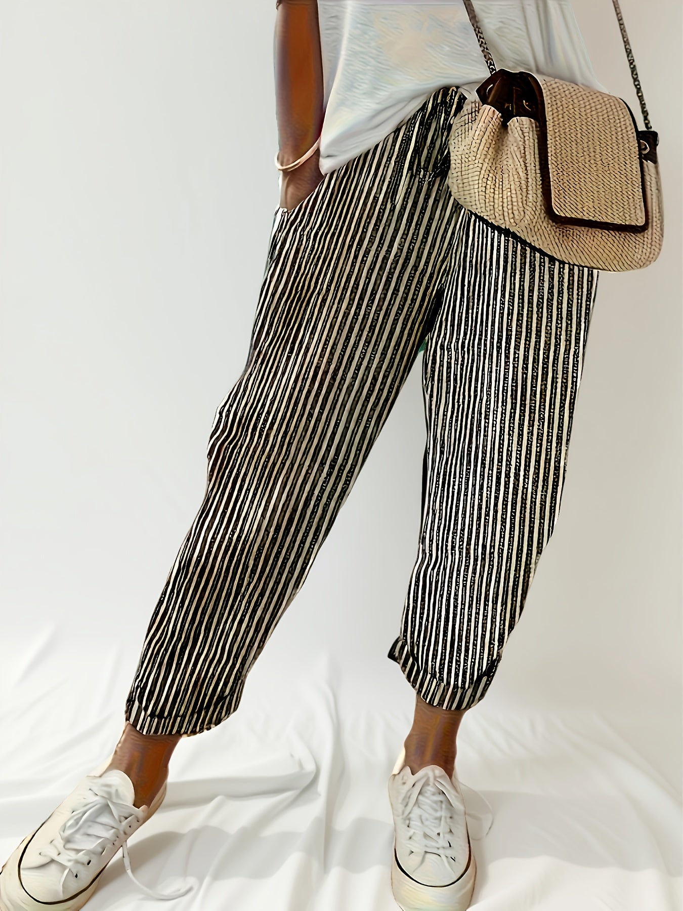 This women’s loose fit casual pants feature a clean striped pattern that adds visual interest without overpowering the overall look. Designed with a balanced silhouette, they support ease of movement while maintaining a tidy, casual appearance. Suitable for daily errands, casual outings, or relaxed indoor wear, they adapt easily to different all-season settings.