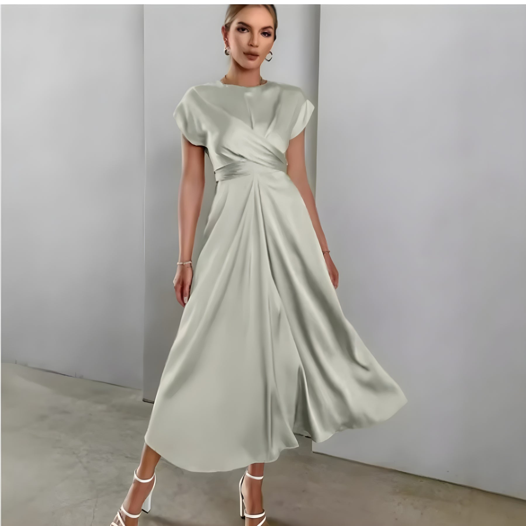 This women’s wedding guest wrap dress in a midi length presents a refined look suited for formal gatherings and celebrations. The wrap neckline creates clean, flowing lines, while the short sleeves support a balanced overall silhouette. Suitable for weddings, receptions, or daytime events, it offers flexible styling with shoes and accessories.